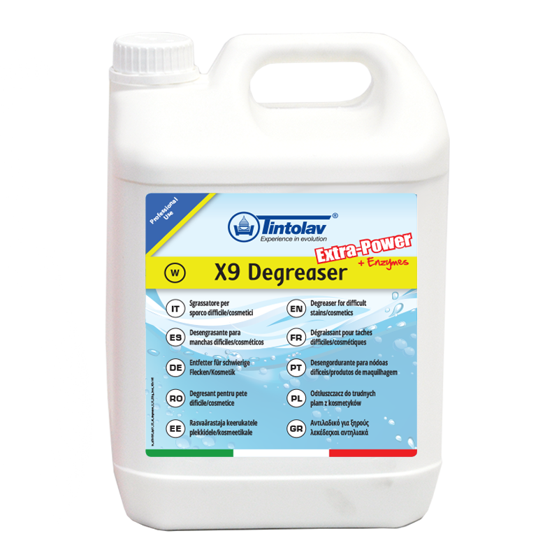 ADDITIVO SMACCHIANTE PER LAVAGGIO AD ACQUAPer un pre trattamento smacchiante e per rimuovere lo sporco dei colli e polsini direttamente nel lavaggio ad acqua è consigliabile utilizzare il prodotto Tintolav® X9 DEGREASER. Questo prodotto può esser utilizzato sia come additivo di lavaggio che come detergente principale. L’X9 Degreaser ha una azione fortemente emulsionante e sgrassante, grazie all’alta concentrazione di solventi e di enzimi, tale da eliminare anche le macchie di cosmetici resistenti all’acqua. Inoltre, è possibile utilizzare il prodotto anche nella pre spazzolatura. X9 Degreaser è il prodotto ad ampia azione sulle macchie e sporco ostinato: • Alta concentrazione di tensioattivi e solventi sgrassanti Modalità di utilizzo: Additivo: Aggiungere 1-3 ml/Kg di X9 Degreaser al detergente utilizzato. |