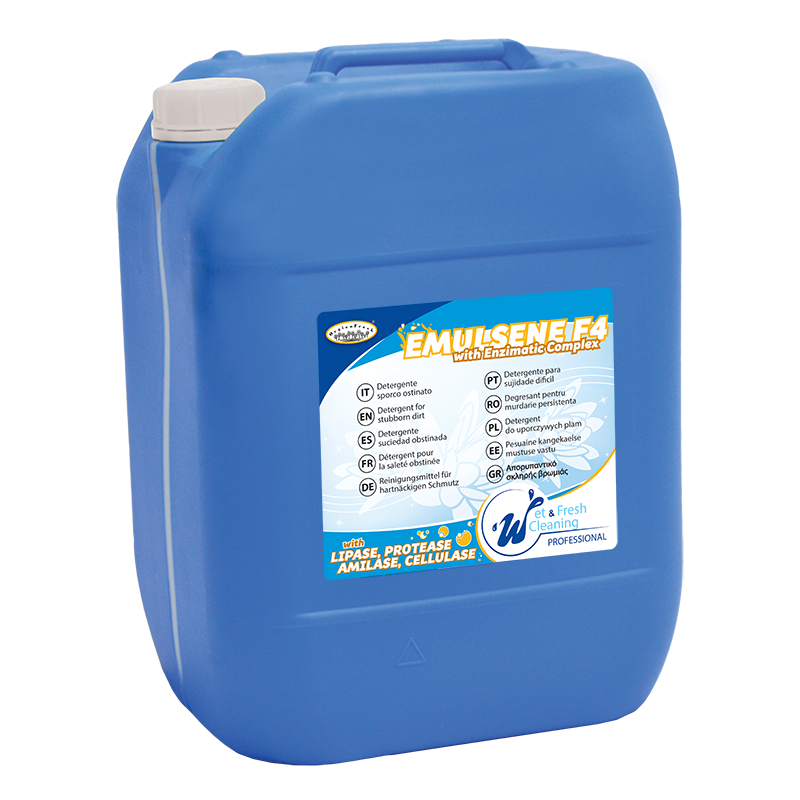 DETERGENTE EMULSIONANTE\SGRASSANTEPer eliminare le macchie di grasso e sporco, ed in particolare le macchie sui colli e polsini, con un detergente unico e completo è consigliabile utilizzare HygienFresh® EMULSENE F4 grazie alla sua formulazione completa con altissima concentrazione di tensioattivi emulsionanti, sbiancanti ottici (per aumentare il grado di bianco delle camicie chiare) ed alta concentrazione di un complesso multi enzimatico (Protease, Amilase, Lipase e Cellulase) per eliminare lo sporco difficile ed emulsionare il grasso e sporco oleoso. • Tensioattivi iperconcentrati per un effetto sgrassante ed emulsionante sullo sporco ostinato Modalità di utilizzo: Detergente: |